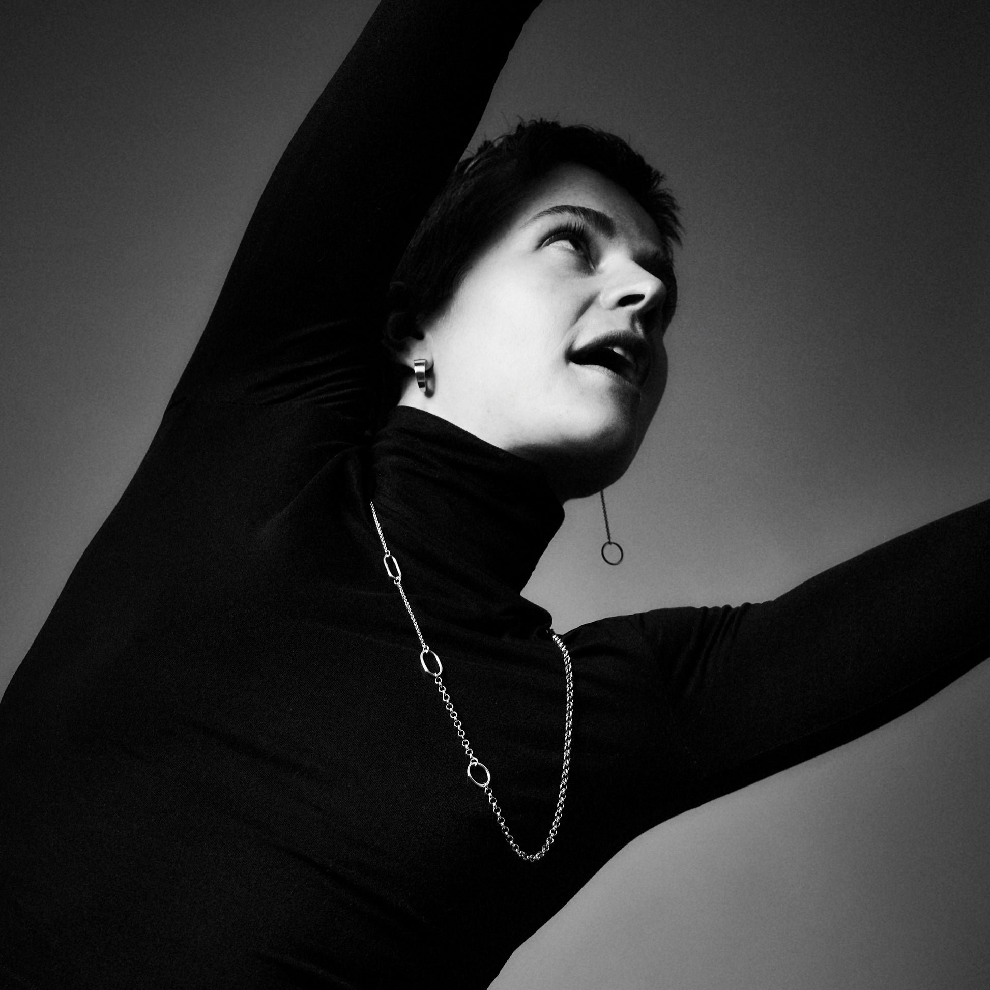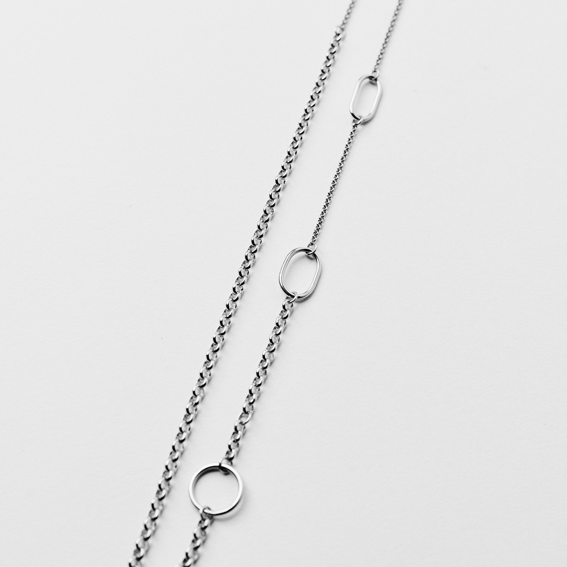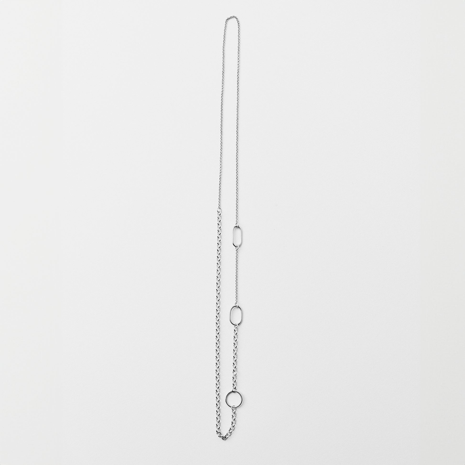 CRUSH NECKLACE is a showcase of transformation. By carefully crushing a circle with a hammer, it bends into a new shape and becomes an oval. This design features a series of circles in various stages of this metamorphosis.