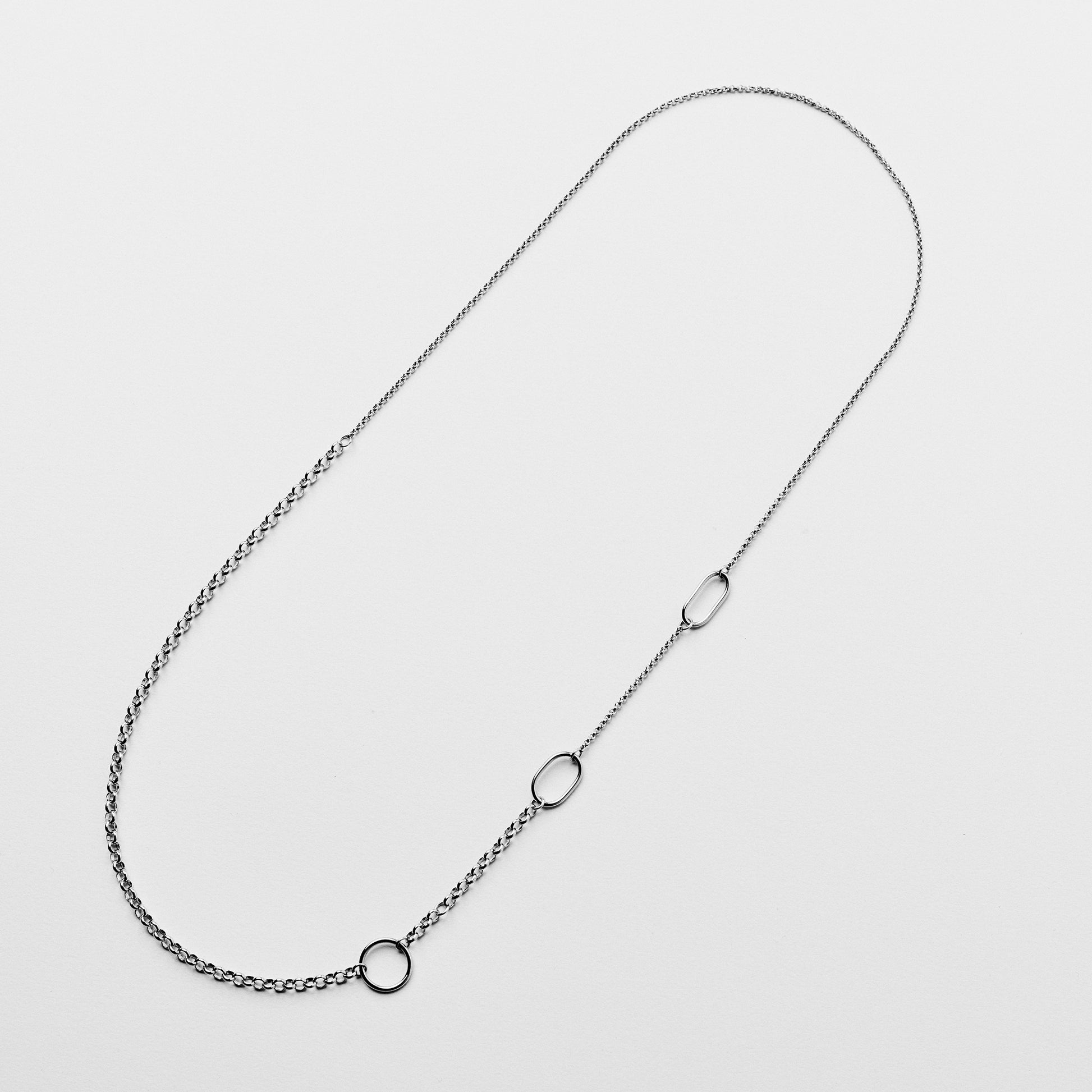 The long length of this necklace makes it easy to slip over your head without the fuss of a clasp. Its dynamic combination of thick and thin chains creates a versatile loop that can be styled in multiple ways, depending on how you position it.